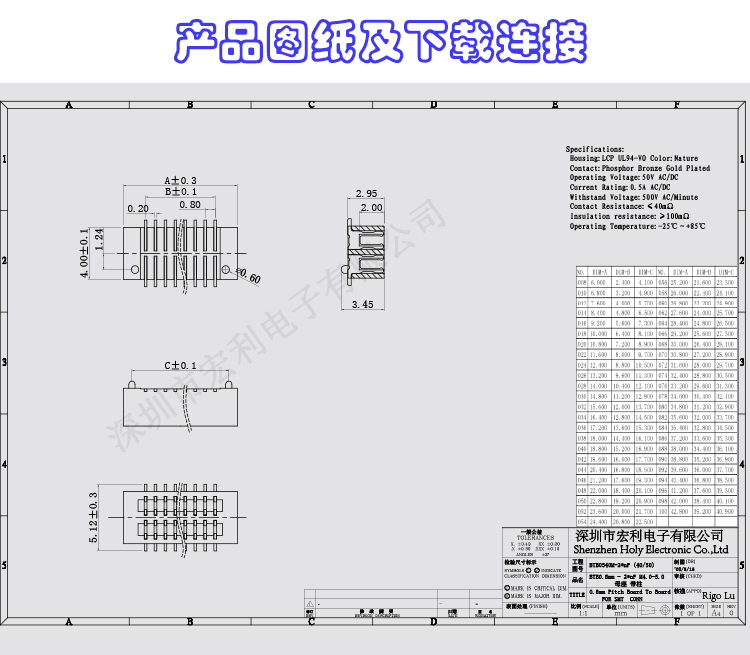 我司主要生产家电连接器,SMT贴片FPC连接器,产品规格从0.3mm、 0.5mm 、1.0mm 、1.25mm、 1.5mm 、2.0MM、2.5mm间距连接器,(FPC排插),板对板 0.5mm 、0.8mm 间距连接器,共四十余种产品,上千种孔位,产品质量无飞边,无毛刺,全部新料注塑,符合欧盟环保,孔位齐全,尺寸稳定,容易搭配,产品价格合理,如贵司有需要,可以随时联系我们,真诚希望能和贵司有合作的机会,http://rigolu.cn.alibaba.com进入公司网址,点击左侧间距目录可快速精确寻找贵司需要的产品。
